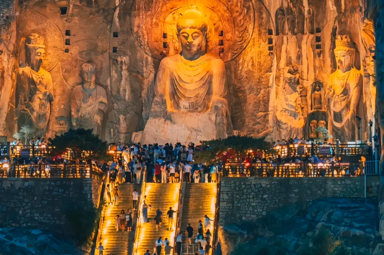 The Longmen Grottoes are listed as a World Cultural Heritage site and are located in Luoyang, Henan. Divided by the Yi River, the grottos are split into two parts: the West Mountain and the East Mountain. The East Mountain grottoes are predominantly works from the Tang Dynasty, while the West Mountain grottoes were carved during the Northern Dynasties and the Sui and Tang periods, featuring the essence of Longmen, including the statue of the Buddha Vairocana in Fengxian Temple and the "Twenty Statues of Longmen" in Guayang Cave.